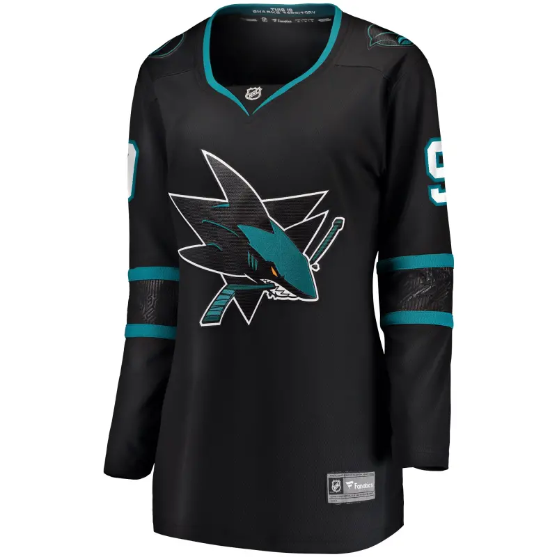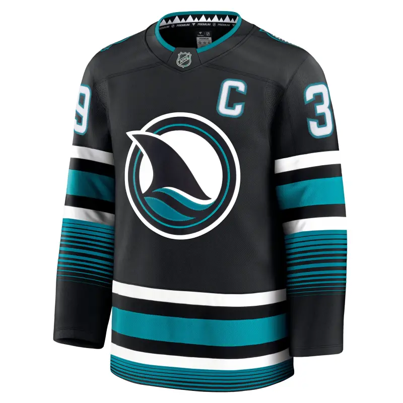 Miesten Fanatics San Jose Sharks -vaihtopelipaita, musta, Premier-tason irtonumerolla.