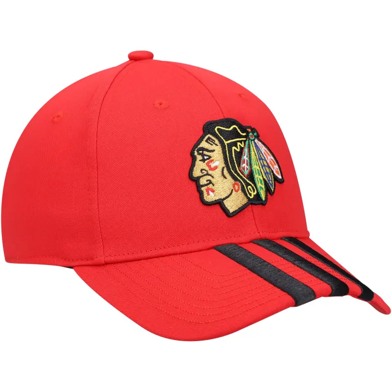 Please Note: This product ships directly from the USA. Add a striking finish to any ensemble with this bold Chicago Blackhawks Locker Room Three Stripe adjustable hat. This slick cap features an embroidered Chicago Blackhawks logo and the signature adidas three stripes on the bill. In addition, the hook-and-loop fastener strap makes finding the perfect fit on the fly simple.